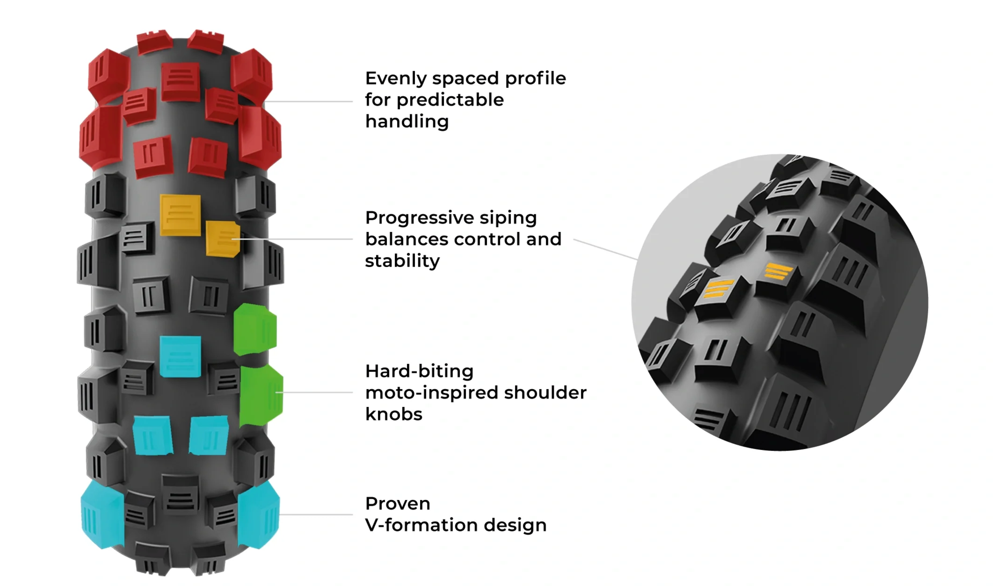 Durable, moto-inspired tread blocks deliver reliable grip, while progressive siping ensures a responsive trail feel, balancing control and stability through every turn. Wide spacing between knobs provides self-cleaning performance, shedding loose soil and sticky mud so traction stays consistent ride after ride.